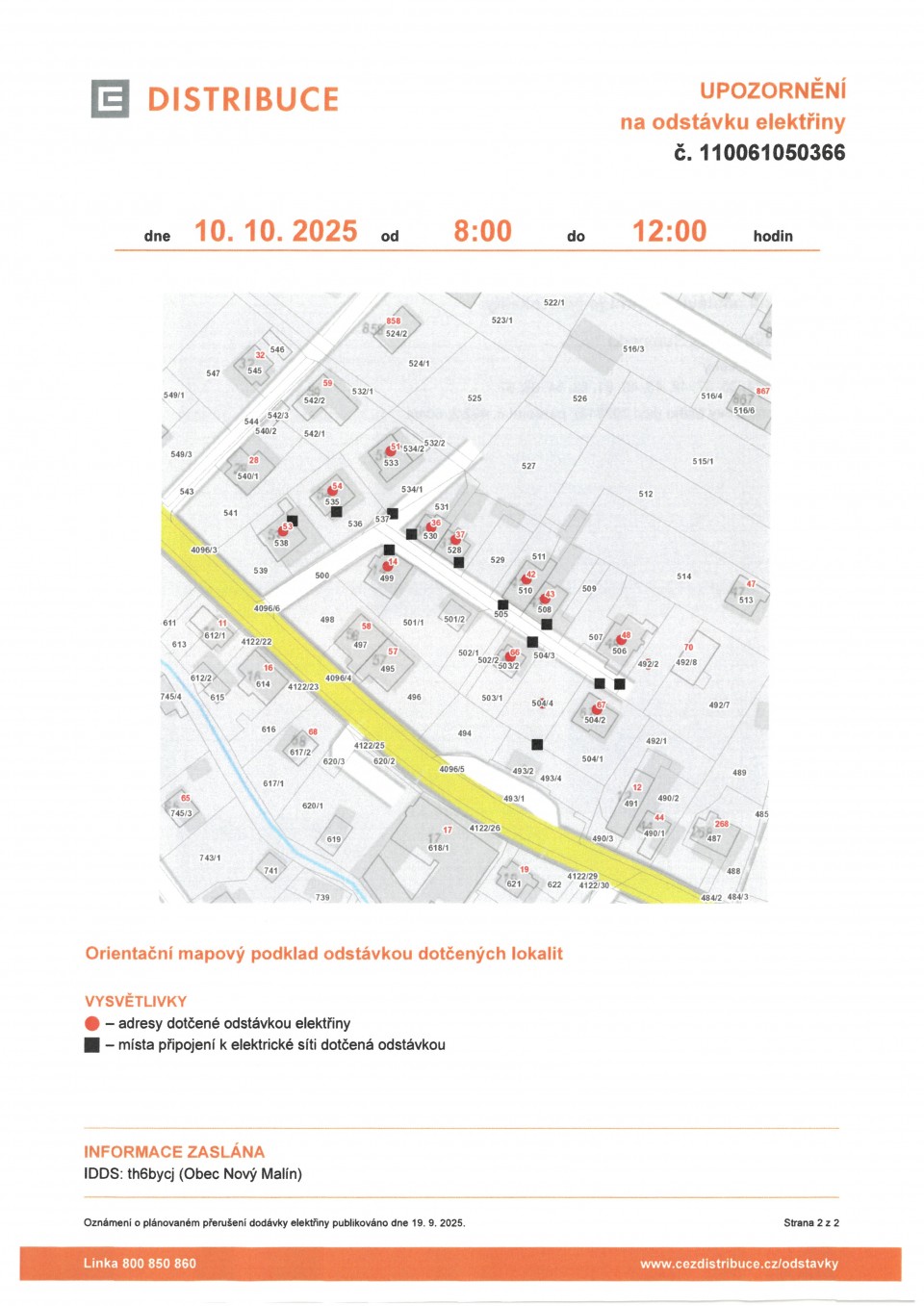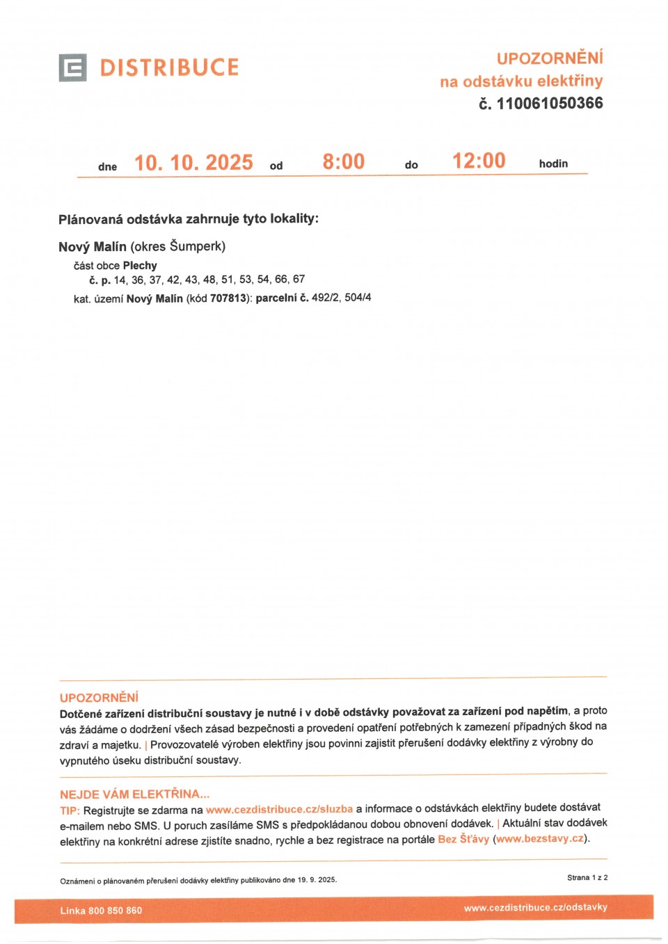 - Oznámení o přerušení dodávky elektrické energie dne 10.10.2025 od 8:00 do 12:00 hodin