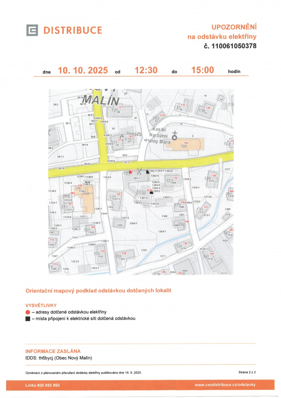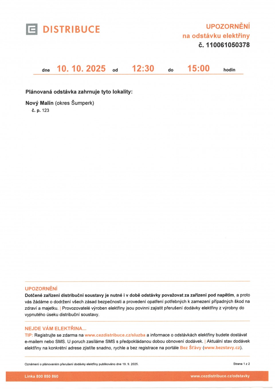 - Oznámení o přerušení dodávky elektrické energie dne 10.10.2025 od 12:30 do 15:00 hodin