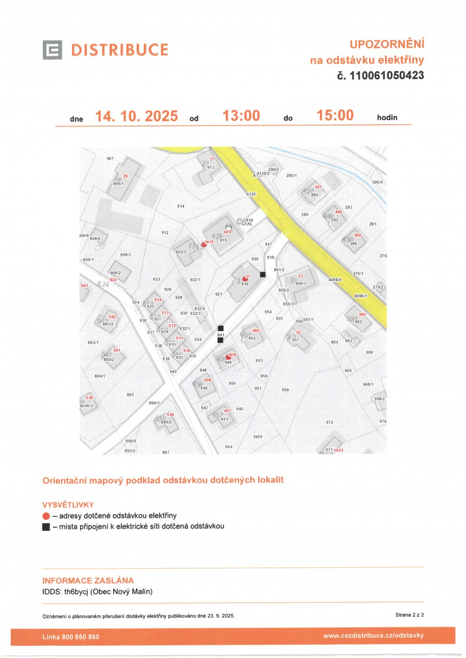 - Oznámení o přerušení dodávky elektrické energie dne 14.10.2025 od 13:00 do 15:00 hodin
