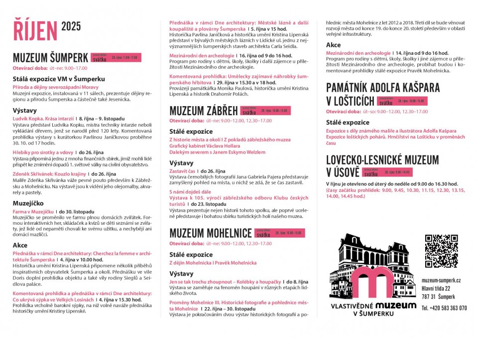 Program Muzea v Šumperku, Muzea Zábřeh, Muzea Mohelnice, Památníku Adolfa Kašpara v Lošticích a Lovecko-lesnického muzea v Úsově na říjen 2025.