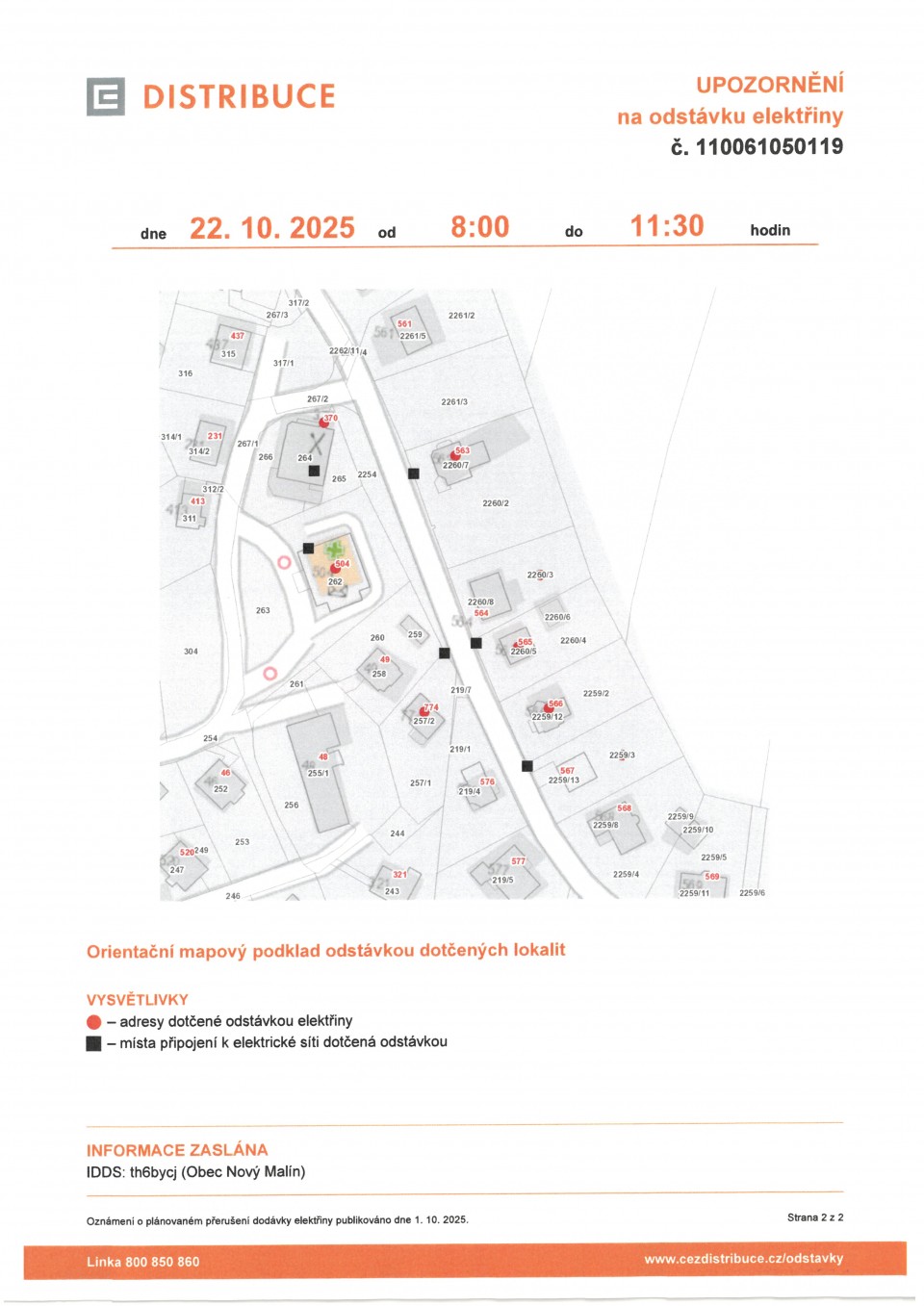 - Oznámení o přerušení dodávky elektrické energie dne 22.10.2025 od 8.00 do 11:30 hodin