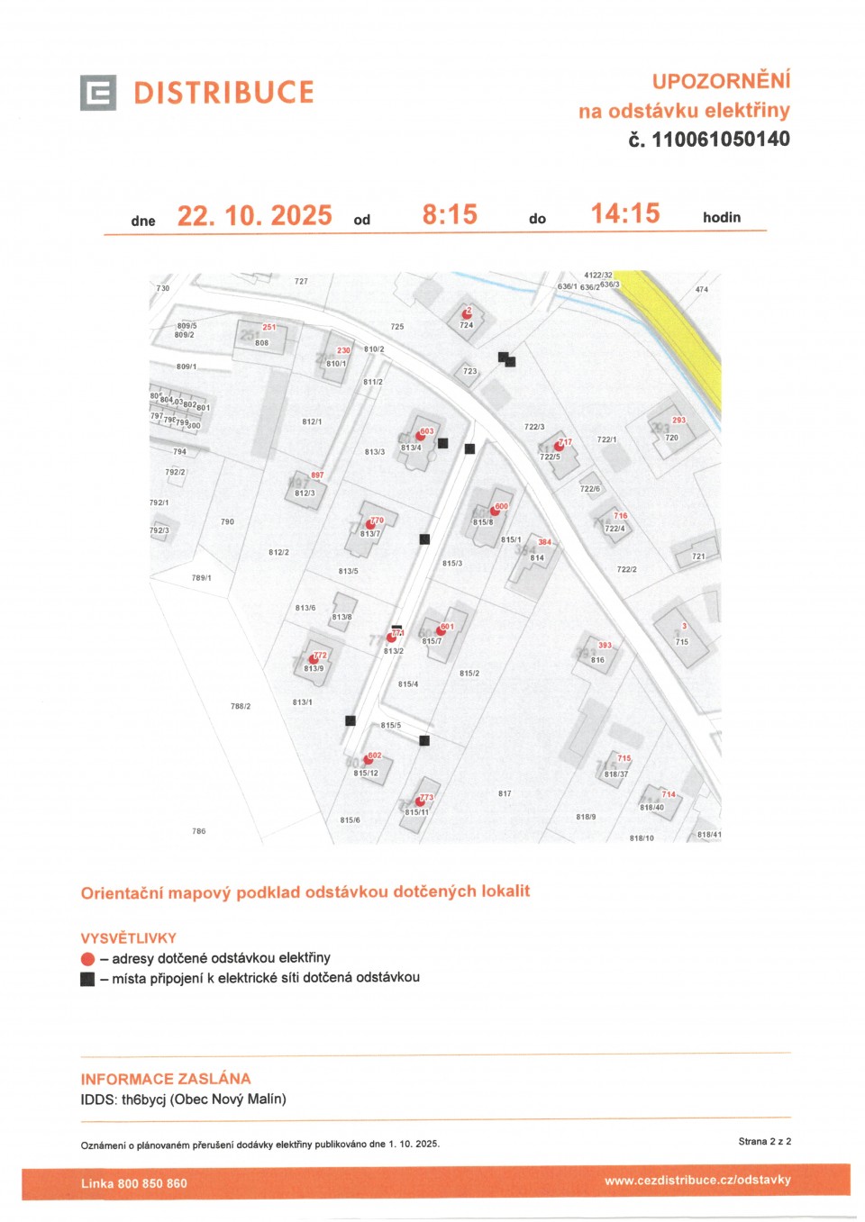 - Oznámení o přerušení dodávky elektrické energie dne 22.10.2025 od 8.15 do 14:15 hodin
