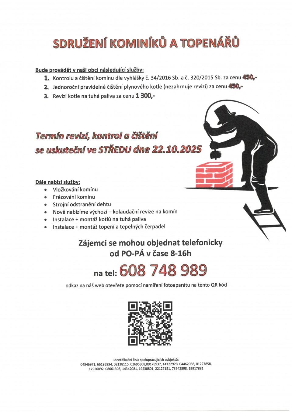 - Sdružení kominíků a topenářů bude provádět v naší obci ve středu 22.10.2025 revize, kontroly a čištění komínů