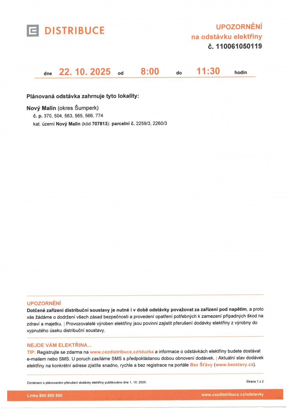 - Oznámení o přerušení dodávky elektrické energie dne 22.10.2025 od 8.00 do 11:30 hodin
