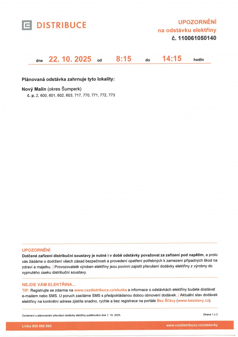 - Oznámení o přerušení dodávky elektrické energie dne 22.10.2025 od 8.15 do 14:15 hodin