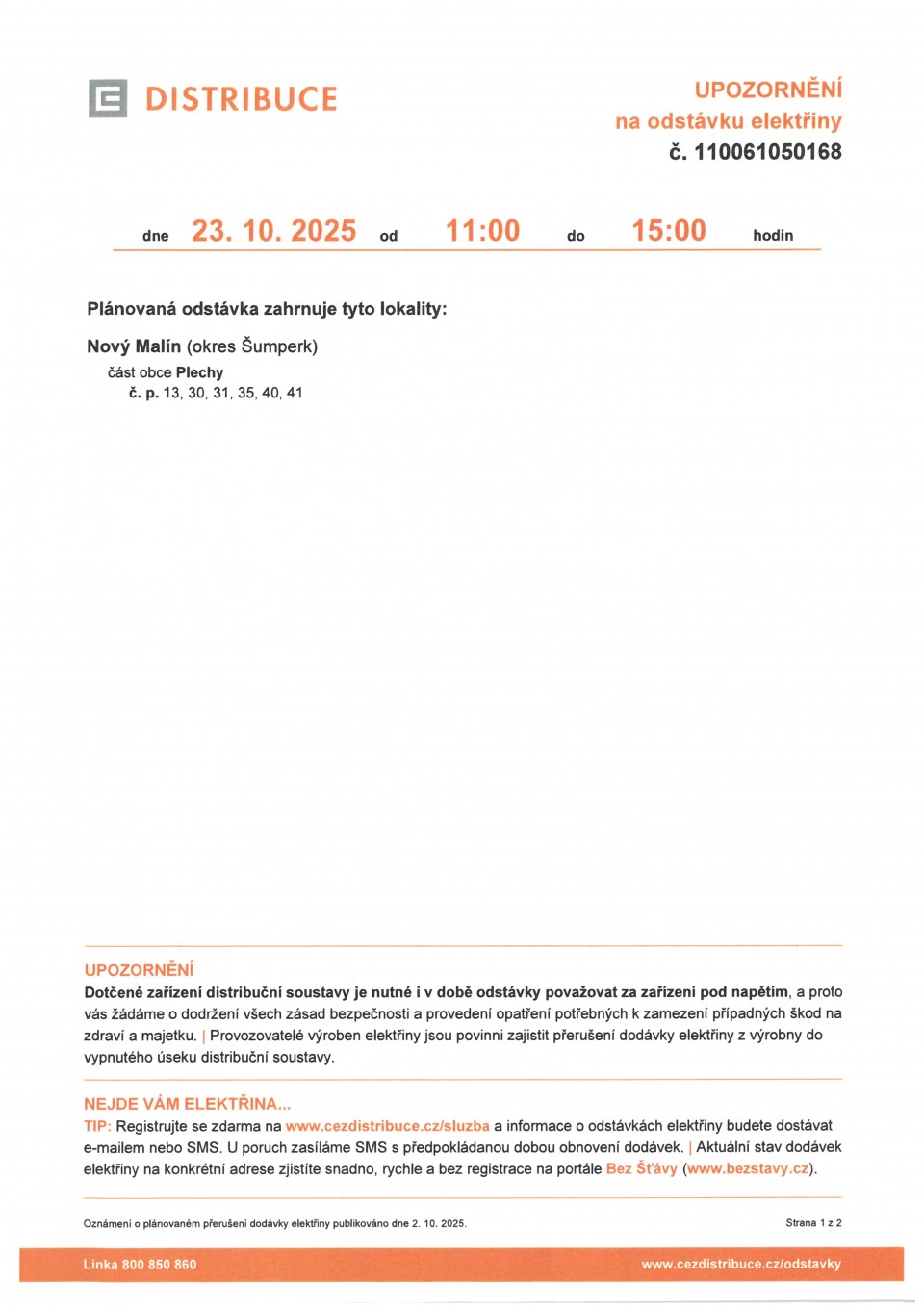 Oznámení o přerušení dodávky elektrické energie dne 23.10.2025 od 11.00 do 15:00 hodin